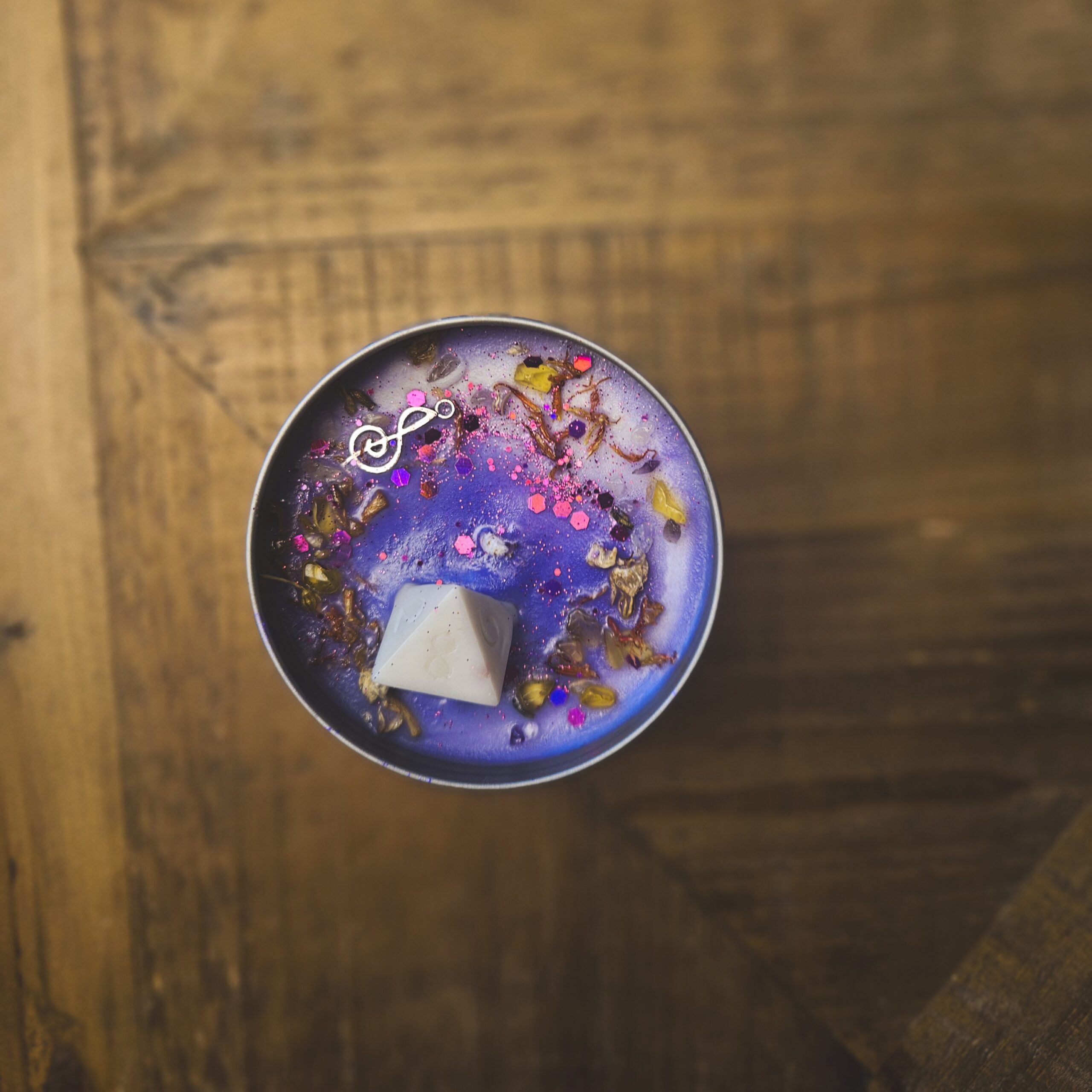 💜 Jasnofioletowy kolor wosku z miką perłową + fioletowe cekiny – subtelny, magiczny blask, który odbija światło płomienia. Fiolet symbolizuje kreatywność, tajemnicę i sztukę.